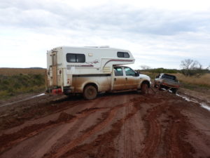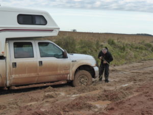 Zum Glück haben wir immer unser Haus dabei und haben in Ermangelung vorbeifahrender potenzieller Helfer an Ort und Stelle übernachtet. In der Nacht hatte der Regen dann auch aufgehört, was Anlass zu optimistischen Plänen gab. Und der erste Vorbeifahrende war dann auch gleich der Helfer in der Not. Mit vereinten Kräften quasi 8×8 war das Problem bald erledigt und wir konnten unsere Fahrt fortsetzen.