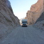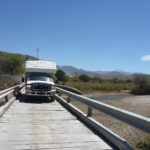 Wieder bewahrheitet sich einer unserer Lieblingssprüche: »Je schlechter der Weg, desto schöner die Landschaft«. Hinter jeder Kurve verbirgt sich ein neues Naturwunder: Felsen in allerlei Formen und den Geologen begeisternden Schichtungen, Flüsse mit sattem Grün oder wieder Sandwüsten mit sukkulenter Vegetation. Davon mal abgesehen war die Straße selbst ein Erlebnis, einspurige Brücken oder Felsentore waren für Hägar ein großes Abenteuer, das er übrigens schadlos überstanden hat. Hoffen wir zumindest…