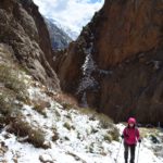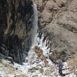 Zwar zeigte unser Thermometer am nächsten Morgen nur 1 Grad, aber dafür sorgte eine von einem grandios blauen Himmel herunter blitzende Sonne für Unternehmergeist. Die Wanderung entlang eines kleinen Gebirgsbaches war so einfach nicht, waren doch einige Überquerungen des selben wegen der vorherrschenden Vereisungen eher knifflig. Sogar 5 Meter Klettersteig waren wohl extra für uns eingebaut worden. Die Mühe belohnte ein wild romantischer Wasserfall, den wir unsere Wegzehrung verzehrend bewunderten.