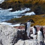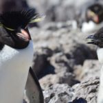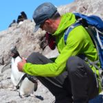 Wir aber waren vor allem wegen ihrer Verwandten hier, den lustig anzuschauenden Felsenpinguinen – von dieser seltenen Art gibt es nur drei größere Kolonien in Südafrika und Südamerika. Die Federzeichnung verleiht ihnen ein Gesicht mit Augenbrauen und Pinselohren, die roten, eigentlich dämonisch wirkenden Augen übertreiben das Ganze und lassen die Gesellen geradezu clownesk wirken. Völlig überrascht waren wir von der Größe der Vögel, die uns gerade mal bis kurz unters Knie reichten. Sie haben keine Scheu vor uns und gehen, als wären wir gar nicht da, ihren gewohntenTätigkeiten nach.
