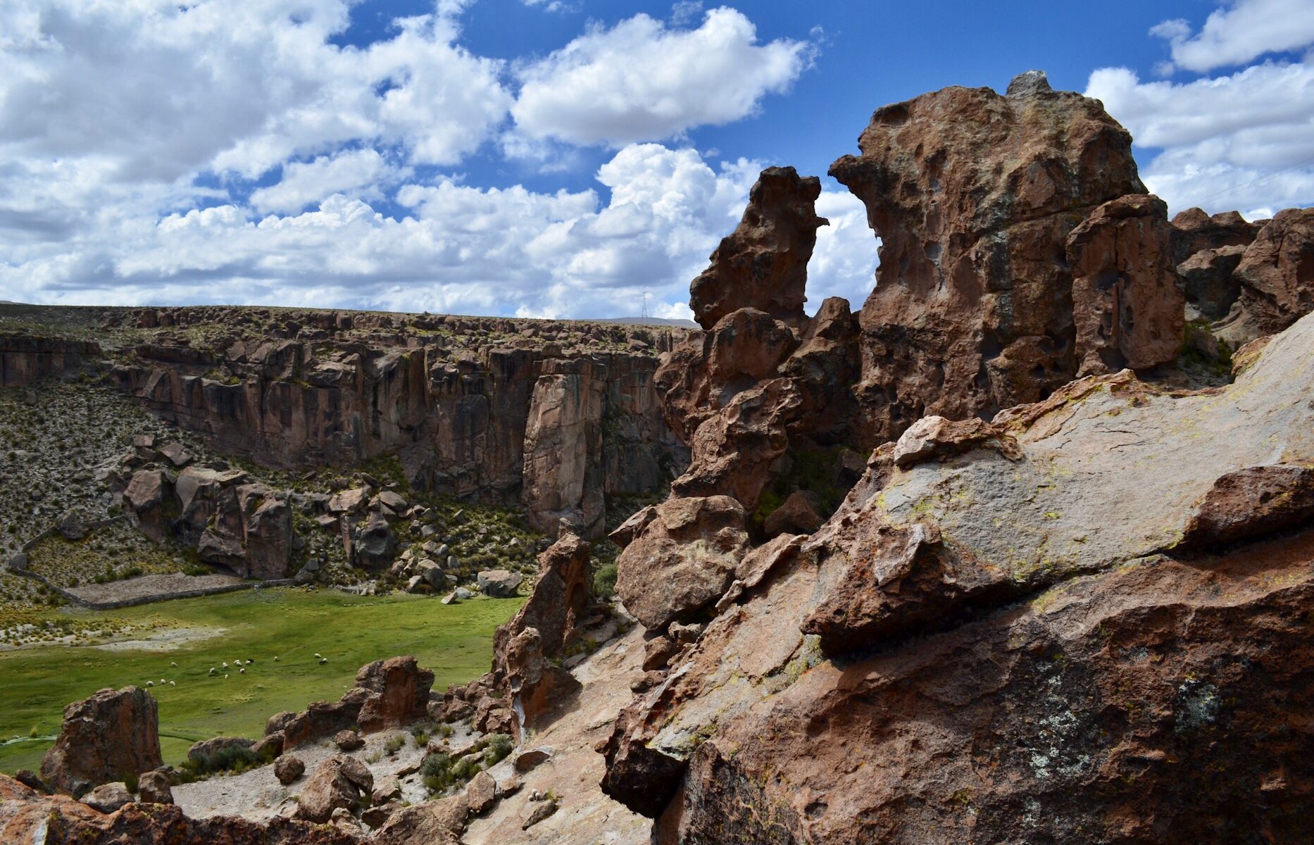 Da haben wir doch wieder mal eine einzigartige Landschaft erwischt! Eingerahmt von Felsmassiven, die aus rötlichem Sandstein bestehen, hat Mutter Natur ein paar Wiesenmatten ausgelegt. Dazwischen plätschern zwei Bächlein, und so freuen sich Lamas, Kühe und Schafe an sattem Grün und frischem Quell. Wir knabbern zwar nicht am Gras und saufen auch nicht aus dem …