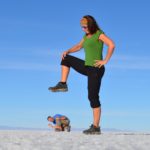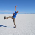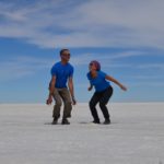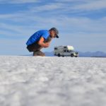 Wenn auch die ersten hundert Meter noch etwas kniffelig sind – in der Uferzone stand noch etwas Wasser und da kann es schon mal Salzschlamm geben – aber dann: freie Fahrt mit knallhartem Salz unter den Rädern. Natürlich gibt es den Drang zu den üblichen Trickaufnahmen, denn dank der Weiße und Weite des Bodens verschwimmen die Distanzen. Und wir lassen unserer guten Laune freien Lauf.