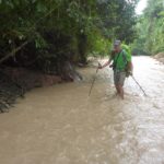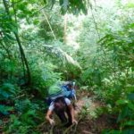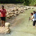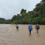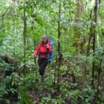 Im Nachhinein betrachtet war es wirklich toll! Wir hatten unsere beiden Führer Honório und Leopoldo nur für uns. Quer durch den dichten Regenwald waren wir fünf Tage lang zu Fuß unterwegs, zunächst auf winzigen Pfaden entlang kleiner Flüsschen und über einen Bergrücken hinweg. Dann verloren sich die letzten Trittspuren und ein neuer Flusslauf wurde zum Weg selbst. Oft musste das Wasser überquert werden. Anfangs zogen wir noch jedes Mal unsere Schuhe aus oder versuchten, von Stein zu Stein springend, das andere Ufer zu erreichen. Unsere Guides warteten stets mit Geduld auf der anderen Seite, denn sie gingen einfach mitsamt ihrer Schuhe durchs Wasser. Mit zunehmender Breite des Flüsschen mussten wir zwangsläufig auch auf diese Methode umstellen. Unsere Schuhe wurden vier Tage lang nicht trocken, stellenweise reichte uns das Wasser bis über die Hüfte. Vermutlich gibt es kaum eine Outdoor-Bekleidung, die für diese Art zu Reisen gemacht ist. Glücklicherweise ließ sich abends am Feuer vieles wieder trocknen.