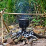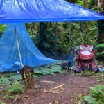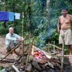 Die Nachtlager muteten spartanisch wenn nicht gar minimalistisch an. Mit der Machete wurde ein Quadrat Wald von Kraut und Sträuchern befreit. Zwei größere Astgabeln wurden in den Boden gerammt und eine Querstange für die Plane aufgelegt. Die Ecken des Daches wurden mit stets frisch aus Balsa-Rinde gewonnenen Riemchen gestrafft. Für den Untergrund wurden Palmwedel herangeschafft, darauf kam dann unsere Isomatte nebst Moskitonetz. Nebenbei wurde aus harzreichen Hölzern ein Feuer entfacht. Bemerkenswert waren Effektivität und große Erfahrung, mit der Honório und Leopoldo ans Werk gingen und innerhalb einer gefühlten halben Stunde sowohl das Nachtlager gebaut und ein Essen vorbereitet hatten, von der wohltuenden Wirkung des Feuers mal ganz abgesehen.