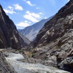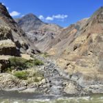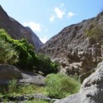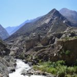Wir verlassen das liebliche Tal des Río Santa, in dem wir einfach seinem natürlichen Lauf folgen. Wenige Kilometer hinter Caraz rücken die beiden Andenketten dicht aneinander heran und der Fluss hat eine enge Schlucht ins Gestein gefressen. Woher der Cañon del Pato, zu deutsch Entenschlucht, seinen Namen hat, ist nicht belegt (vielleicht, weil es hier keine Enten gibt). Wegen der einstmals zahlreichen Minen gab es hier nur eine Eisenbahnlinie, für die nicht weniger als 50 Tunnel unterschiedlicher Länge in den Fels gesprengt wurden. Auf dem einstigen Bahndamm verläuft heute eine geteerte Straße, die logischerweise nicht viel breiter gebaut werden konnte. Stellenweise hat sich der Berg ein Stück der Trasse zurückgeholt, dann schweben die rechten Räder mitsamt der Beifahrerin in schwindelerregender Höhe.